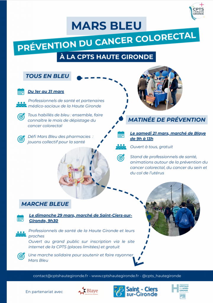 À l’occasion de Mars Bleu, mois national de sensibilisation au dépistage du cancer colorectal, la CPTS Haute Gironde se mobilise avec de nombreuses actions sur le territoire. Professionnels de santé, partenaires, habitants : ensemble, faisons de la prévention une priorité visible et collective !